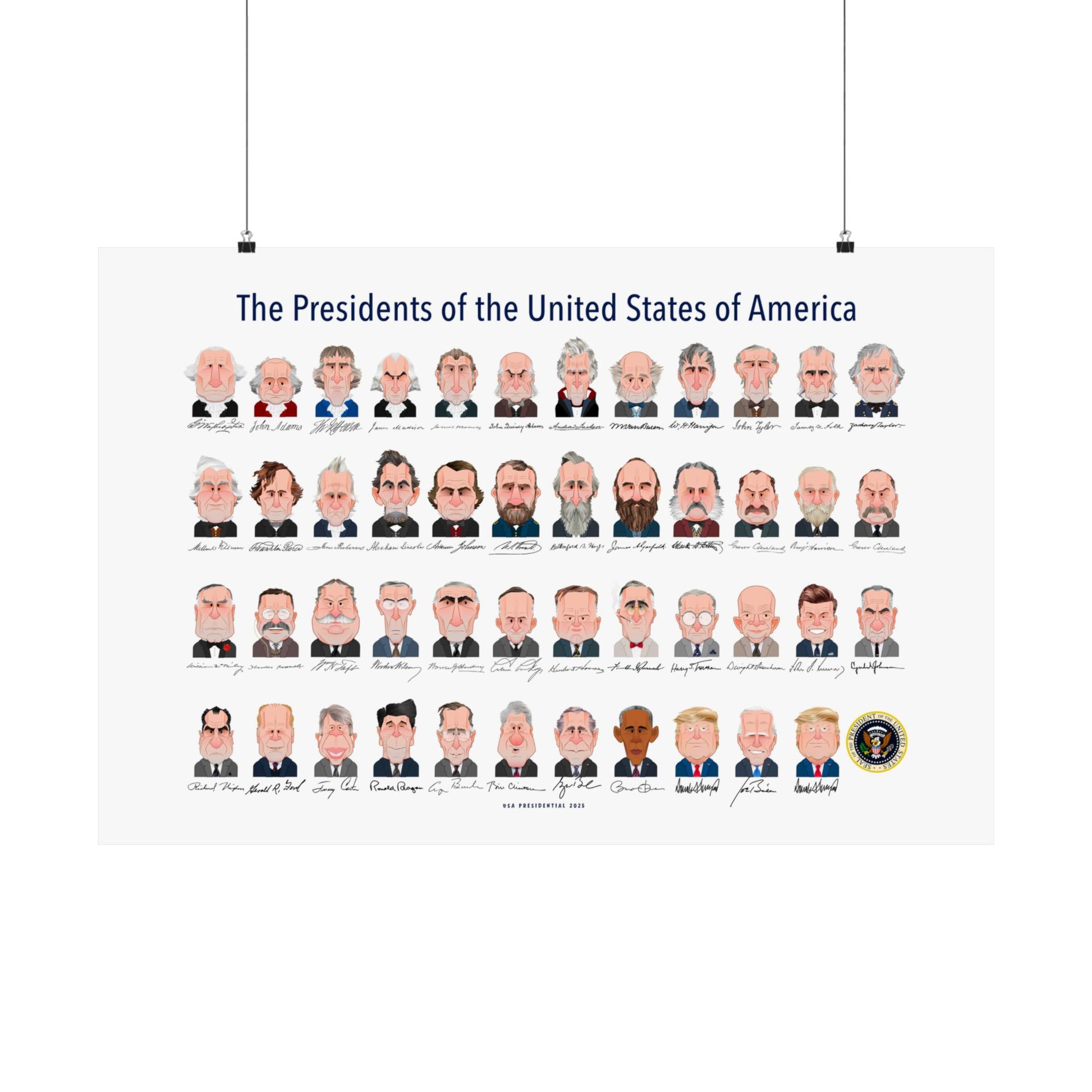 Meet the presidents like never before! This vibrant, cartoon-style caricature poster features all 47 U.S. Presidents in bold detail — from Washington to Biden — each brought to life with unique expressions and personality-packed style. It’s the perfect blend of humor, history, and art.
